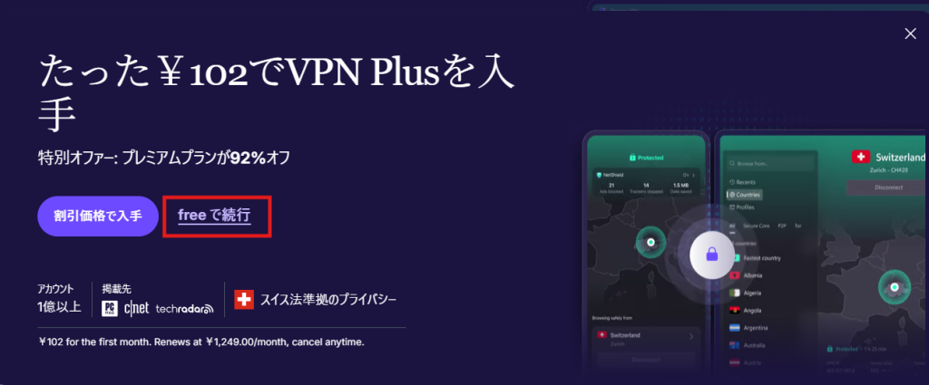 無料プランの説明画面で「VPN Freeで続行」ボタンをクリックします。